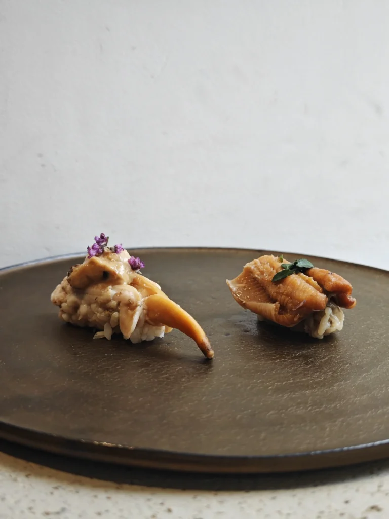 握りゾットは、シャリにバルサミコ酢など使用した洋風のお寿司仕立て。数種類シャリで和洋折衷の握りのコースです。
