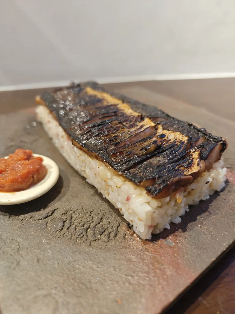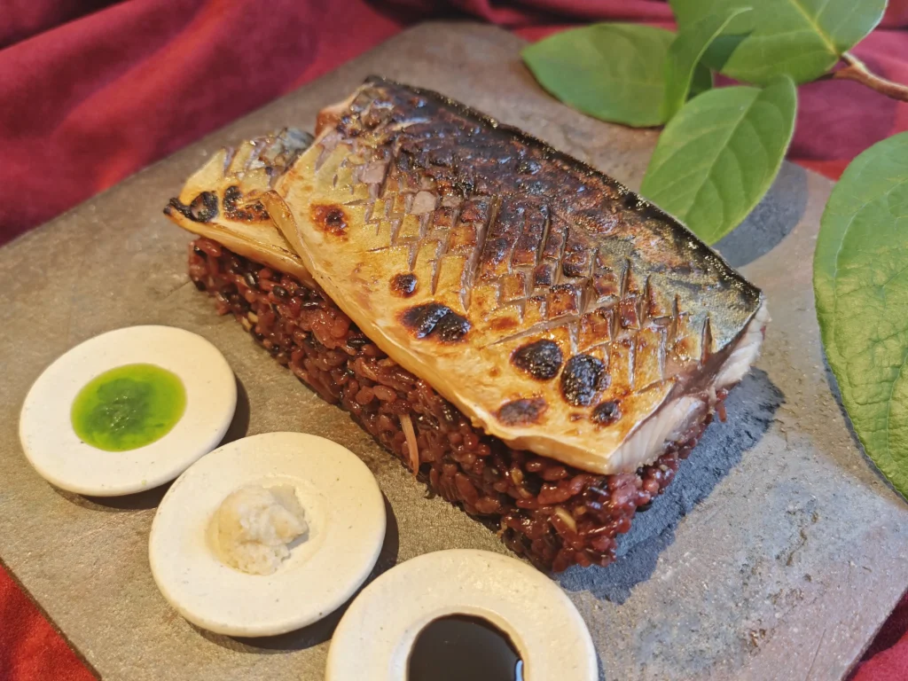 鯖は、旨みの強い醤油を塗って炙ってあります。黒米のバルサミコご飯。